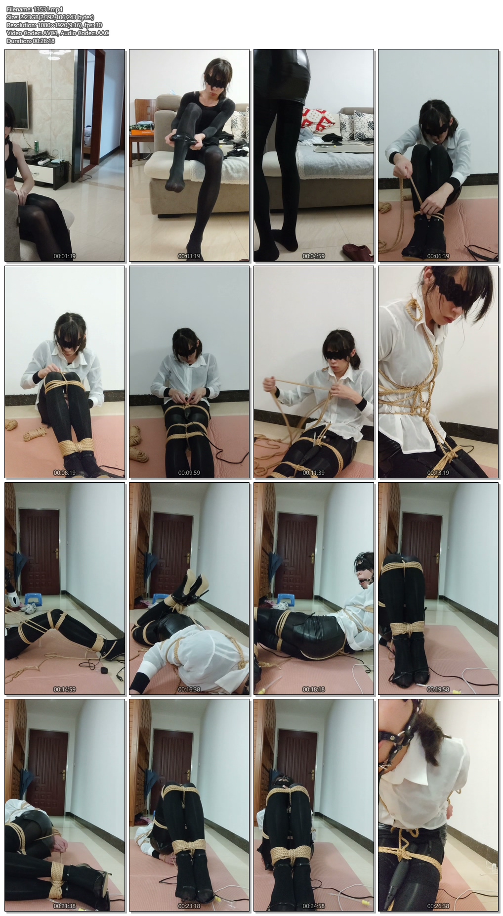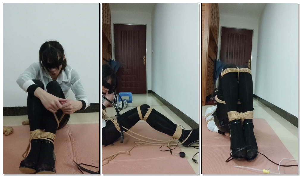 有恋物癖情节,服装是黑连体丝袜加欧式束腰,外面是OL制服包臀裙,还穿了一双吊带黑丝,涂了指甲油,高跟凉鞋。束缚完毕后启动定时锁,挣扎时连体丝袜与绳子摩擦肌肤,ZDB最大功率顶住下面。不一会口水就不断地从口球里流出来,刚开始没多久就到了一次,后面又到了两次,整个人都浑身酥麻。实际捆绑放置时间接近一个半小时,剪辑只保留了关键部分(用力挣扎gc的时候)。原本想做一个jy采集瓶子,可惜没固定好掉了,下次再看看怎么改进。用花纹蕾丝蒙上眼睛人看着没那么丑,而且能看到镜头调整姿势。6:03之前是换装过程,16:53定时锁启动开始享受。有呻吟(男音)和口水流出