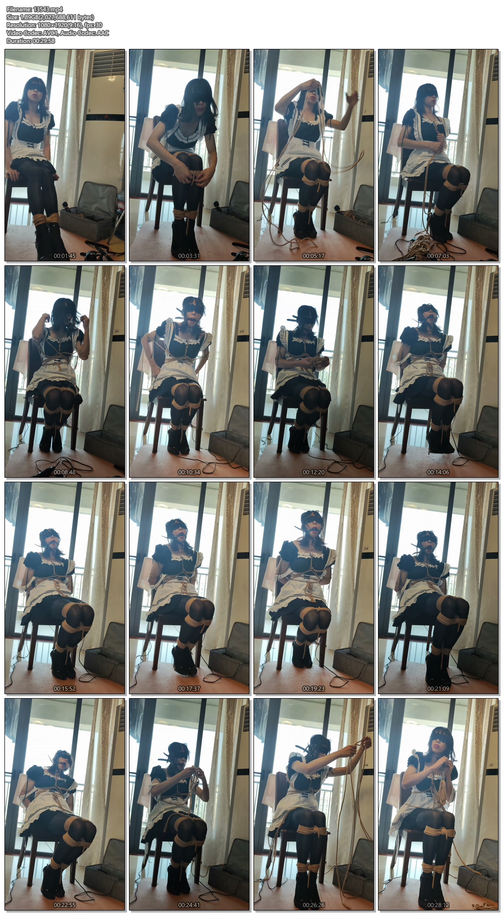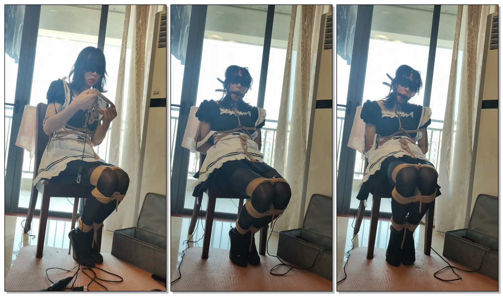 阳光明媚的一天,来兴致就直接在阳台边玩自缚了。这次是可爱的女仆噢,没有绑马尾这一次。坐在椅子上,用一条卡扣收紧绳连接脚腕和椅子还有脖子,拉紧可以把自己固定在椅子上。绑好脚,再把大臂绑起来,然后用另外一条卡扣收紧绳连接绳套。把收紧绳固定在后脖子,手腕放进绳套,拉紧,在定时锁解开前就完全被拘束了,用力挣扎也无济于事。棒棒的功率太大了,s了以后很快就忍不了了,像被责了一样,手够不到,大腿用力很勉强才挤开一点。这次用后置摄像头录的,感觉画面舒服了很多,女仆装也让我臭美哈哈哈哈