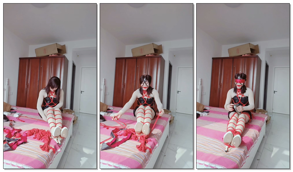 自缚3 穿着白色高跟鞋,红色绳子捆绑,口球,蒙眼各种buff叠加。走绳丝滑,捆绑驷马自缚,痛苦并快乐着
