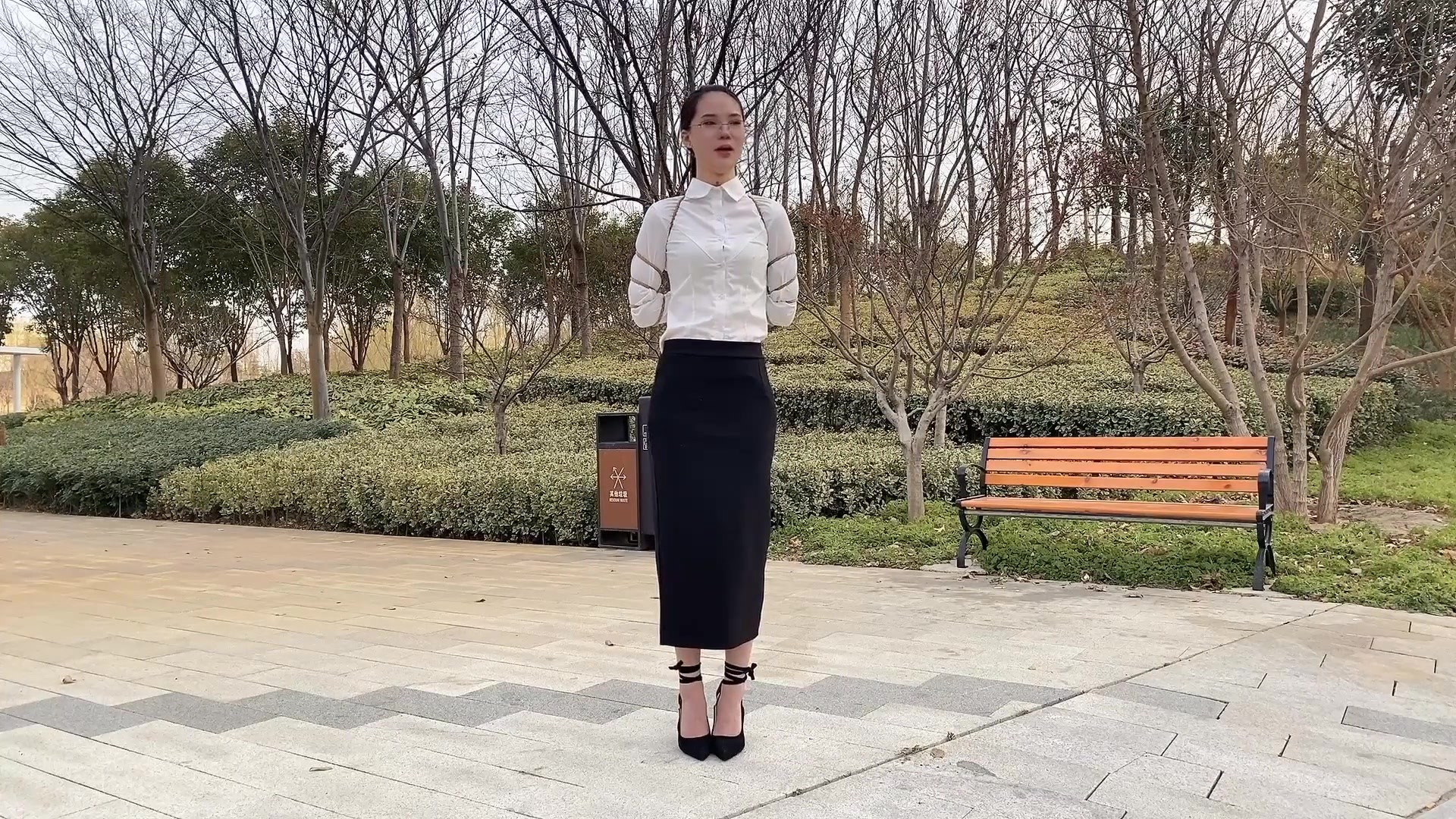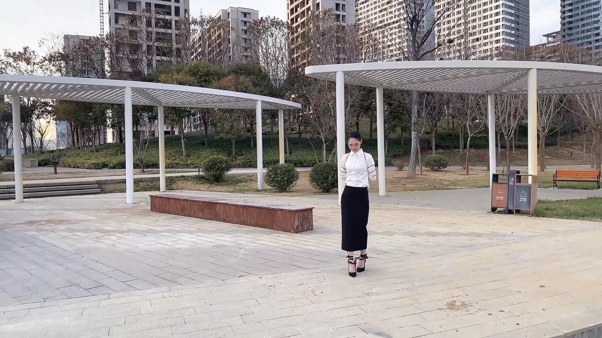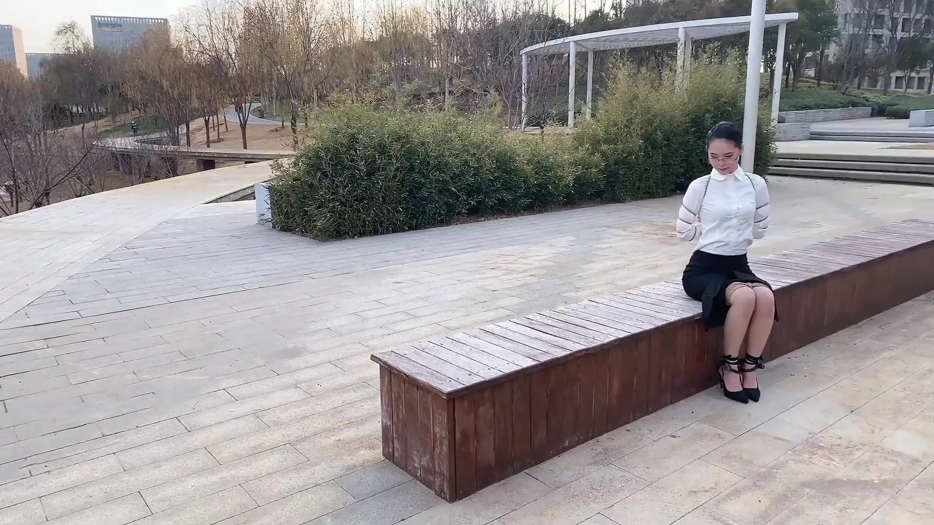 模特170,穿上高跟鞋后更显亭亭玉立,看起来气质很好,恬静,几度的寒风中模特连丝袜都没穿,公园中还有不少人,模特的脸不知是冻得通红还是羞得通红,高跟鞋踩在木板上使得脚镣的声音分外刺耳