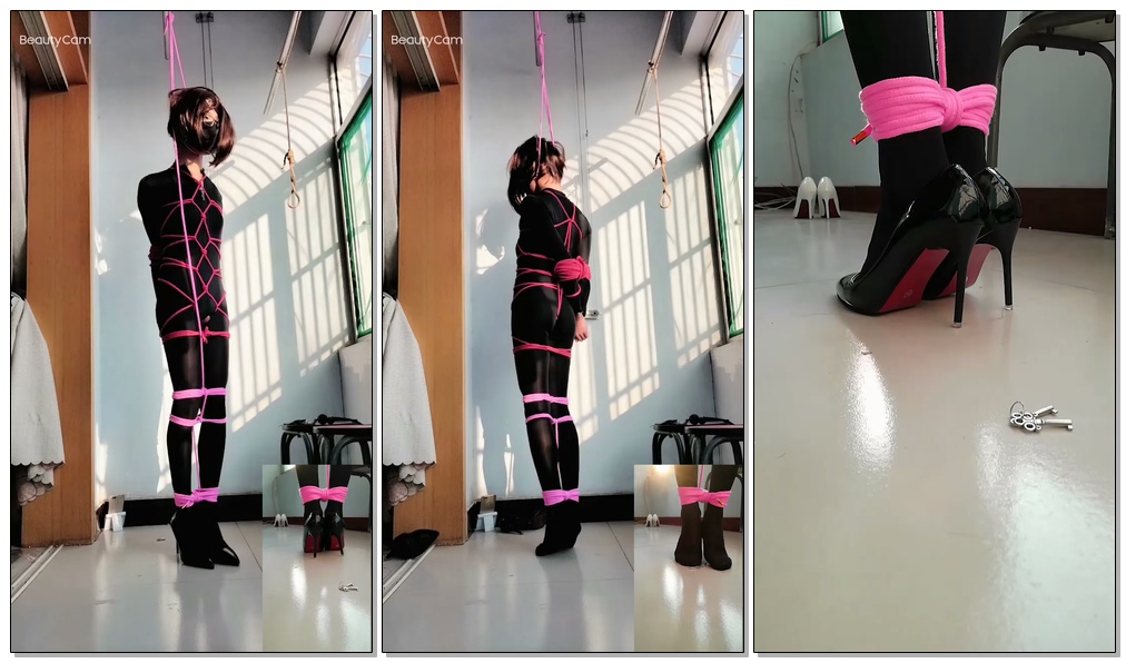 【玩家自缚】情趣紧身衣,脚部放黄豆,强制踮脚,痛苦呻吟。手铐自缚,钥匙掉在地上,吊缚、够不到钥匙,脱出不能。